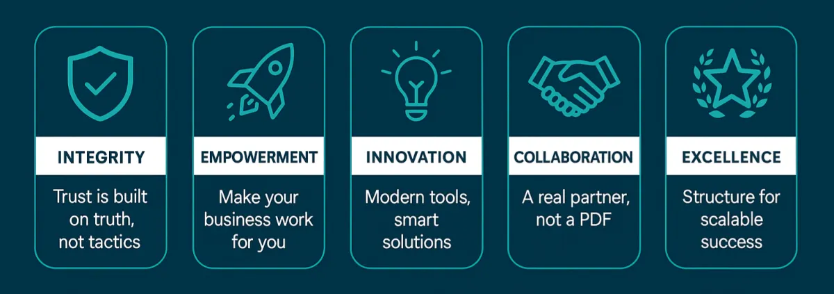 Every recommendation, strategy, and solution is built on transparency and truth - not on clever tactics or smoke and mirrors. We believe that long-term business relationships are forged through honesty, open communication, and delivering what we promise, even when it means tackling tough challenges head-on. Our clients trust us to guide them through complexity with candor, helping them avoid costly missteps and focus on what genuinely drives progress.